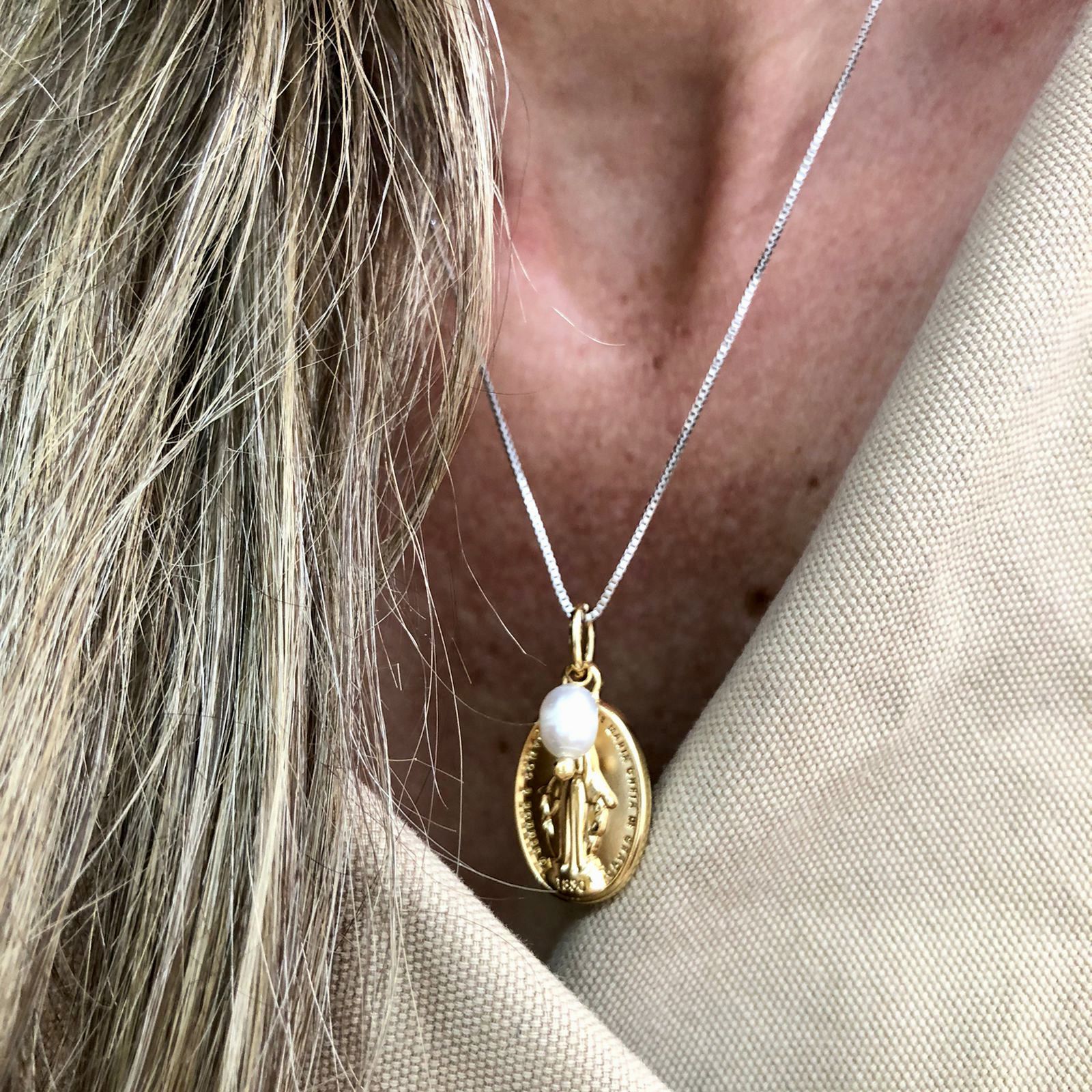 Medida da corrente: 45cm de comprimento + 5cm de extensor Medalha: 2cm Pérola de água doce